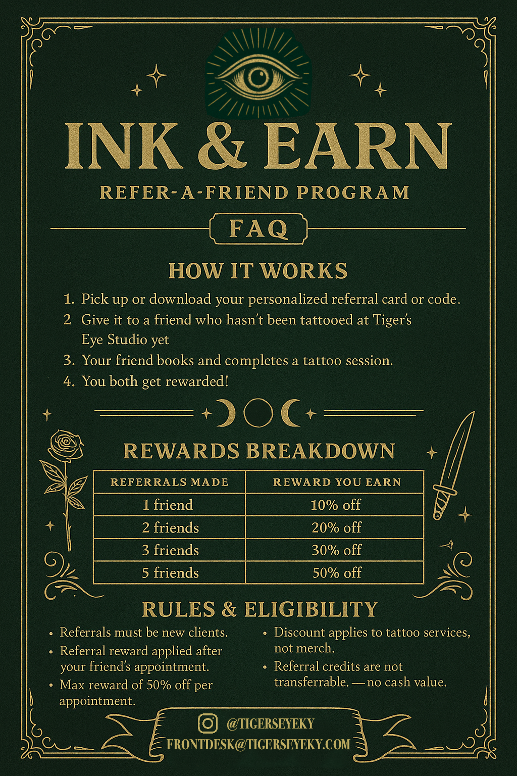Welcome to Ink & Earn, Tiger’s Eye Studio’s official referral program! We created this program to reward our most loyal clients for sharing the studio with friends, family, and fellow tattoo lovers.